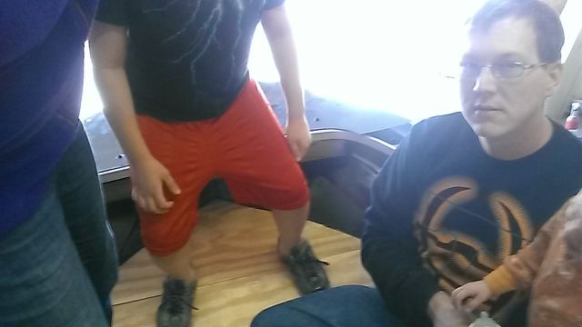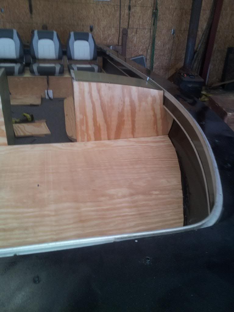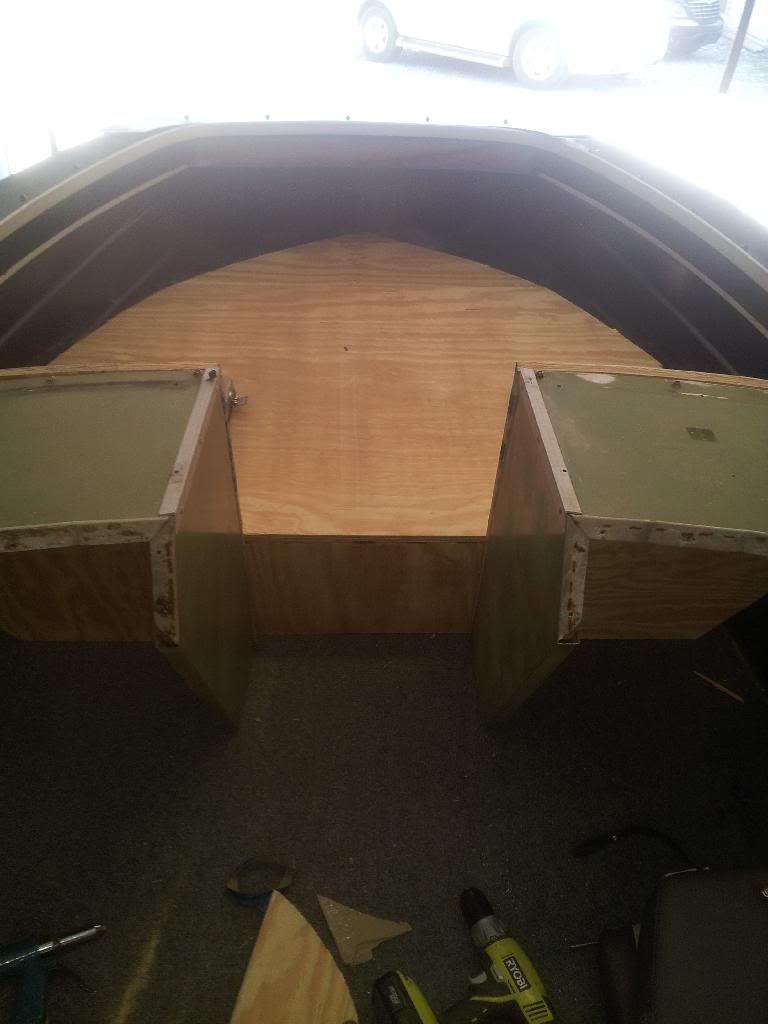 If you look at where the ply meets the splashwell you can see I kept the original starcraft sliding design I just shortened the doors so there is still access to the bilge that way and it is big enough to slide the battery in and out.